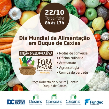 Para marcar o Dia Mundial da Alimentação, celebrado em 16 de outubro, a Prefeitura de Duque de Caxias convida para a Edição Comemorativa da Feira Popular da Agricultura Familiar de Duque de Caxias, que acontece nesta terça-feira, 22 de outubro, das 8h às 17h, na Praça Roberto Silveira (Centro – DC). .