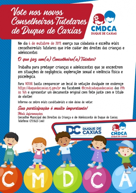 A Prefeitura de Duque de Caxias, através do CMDCA – Conselho Municipal dos Direitos da Criança e do Adolescente, órgão vinculado administrativamente à Secretaria Municipal de Assistência Social e Direitos Humanos realizará, no dia 06/10, a eleição para os novos conselheiros tutelares de Duque de Caxias. .