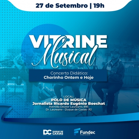 A Prefeitura de Duque de Caxias, através da Fundec - (Fundação de Apoio à Escola Técnica, Ciência, Tecnologia, Esporte, Lazer, Cultura e Políticas Sociais) vai apresentar nesta sexta-feira (27/09), às 19h, a quarta edição do projeto Vitrine Musical, no Polo de música Ricardo Eugênio Boechat, com o tema: "Chorinho Ontem e Hoje". A entrada é gratuita. .