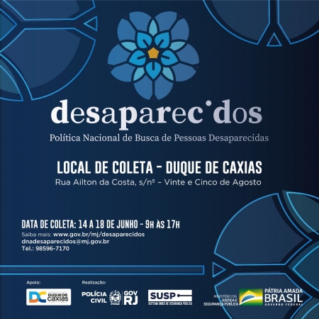 Nesta segunda-feira (14), tem início a Campanha Nacional de Coleta de DNA de Pessoas Desaparecidas. Em Duque de Caxias, a ação tem o apoio da Prefeitura. O local de coleta fica no Posto Regional de Polícia Técnico-Científica, localizado na Rua Aílton da Costa, no bairro Jardim Vinte e Cinco de Agosto, com horário de atendimento das 9h às 17h. O objetivo é auxiliar na identificação e abastecer o Banco Nacional de Perfis Genéticos..