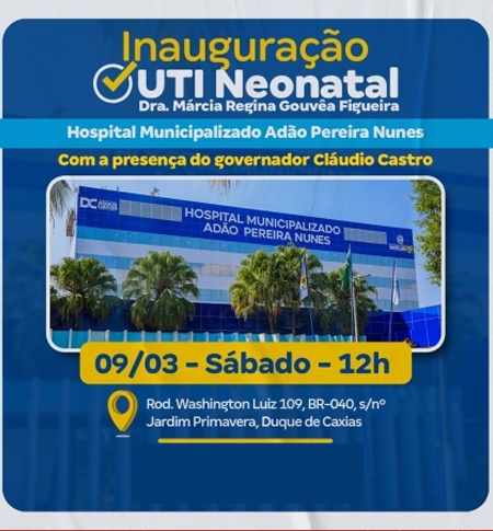 A Prefeitura de Duque de Caxias inaugura neste sábado (09/03) a nova UTI Neonatal do Hospital Municipalizado Adão Pereira Nunes (HMAPN). O evento contará com a presença do prefeito Wilson Reis, do Governador Claudio Castro, entre outras autoridades municipais e estaduais. .