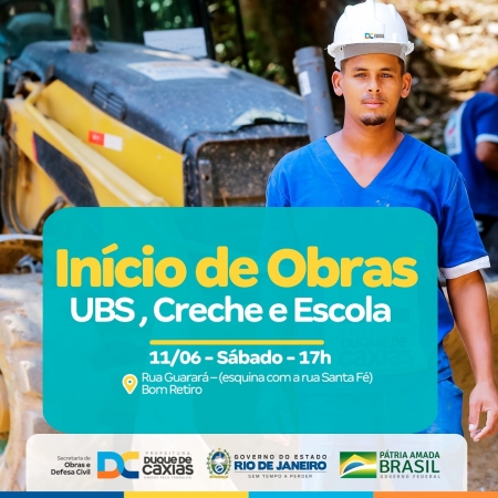 A Prefeitura de Duque de Caxias vai anunciar neste sábado (11) o início das obras de construção de uma escola, uma creche e uma UBS – Unidade Básica de Saúde - no bairro Bom Retiro, no segundo distrito. O anúncio será feito às 17h, pelo prefeito Wilson Reis, junto com o secretário municipal de Obras, João Carlos Grilo, na esquina das ruas Guarará e Santa Fé..