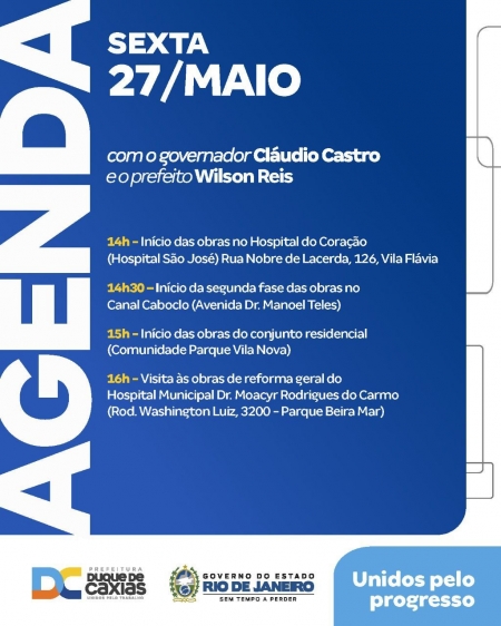 O município de Duque de Caxias recebe a visita do governador Cláudio Castro, nesta sexta-feira (27/05), a partir das 14h, para uma agenda de lançamentos e visitas às obras que acontecem na cidade nas áreas da saúde, infraestrutura e urbanismo. O prefeito Wilson Reis acompanhará a comitiva do Governo Estadual junto a lideranças e representantes do Executivo e Legislativo municipal..