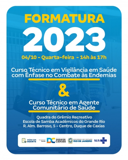 A quadra do Grêmio Recreativo Escola de Samba Acadêmicos do Grande Rio, em Duque de Caxias, receberá, nesta quarta-feira (04), o evento de formatura dos Agentes Comunitários de Saúde (ACS) e dos Agentes de Combate às Endemias (ACE) que concluíram os cursos de Técnico de Agente Comunitário de Saúde e Técnico de Vigilância em Saúde com Ênfase no Combate às Endemias..