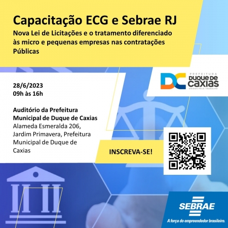 O Serviço Brasileiro de Apoio às Micro e Pequenas Empresas (SEBRAE), juntamente com o Tribunal de Contas do Estado do Rio de Janeiro (TCE-RJ), por meio da Escola de Contas e Gestão (ECG), com apoio da Secretaria Municipal de Controle Interno de Duque de Caxias, promoverá, no dia 28 de junho de 2023, das 09h às 16h, no auditório da Prefeitura, a Palestra - Nova Lei de Licitações e o Tratamento Dispensado às Micro e Pequenas Empresas nas Contratações Públicas..