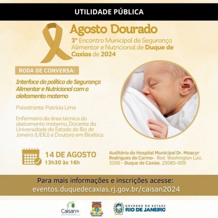 O Dia Mundial da Amamentação (01/08) é o pontapé inicial para o Mês do Aleitamento Materno, época em que a Prefeitura de Duque de Caxias realiza uma série de ações de promoção, apoio e incentivo dessa atividade benéfica para os bebês e as mães. Uma delas será o 3º Encontro de Segurança Alimentar e Nutricional, que terá como tema “Interface da Segurança Alimentar e Nutricional com o Aleitamento Materno”. O evento ocorrerá no dia 14 de agosto de 2024, às 13h30, no Auditório do Hospital Moacyr Rodrigues do Carmo, e será organizado pela Câmara Intersetorial de Segurança Alimentar e Nutricional de Duque de Caxias (CAISAN-DC). .