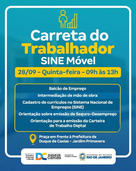 A Prefeitura de Duque de Caxias, através da Secretaria Municipal de Trabalho, Emprego e Renda, em parceria com a Secretaria Estadual de Trabalho e Renda, vai promover a chegada da Carreta do Trabalhador (SINE Móvel) ao município, no dia 28/09, das 9h às 13h, na praça em frente à Prefeitura, no Jardim Primavera..