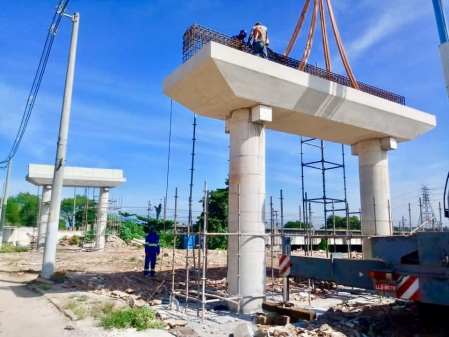 Foi concluída na manhã desta sexta-feira (10), mais uma etapa da construção do Viaduto do Gramacho. O secretário de Obras de Duque de Caxias, João Carlos Grilo acompanhou com sua equipe técnica a instalação da travessa (canoa) em um dos pilares da Avenida Teixeira Mendes, às margens do Rio Sarapuí. Também foi feito o lançamento da armação do pilar 5, entre o muro da Supervia. .