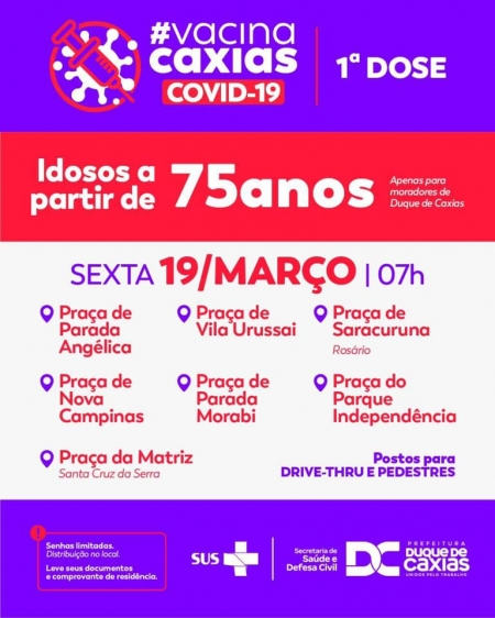 A Prefeitura de Duque de Caxias, através da Secretaria Municipal de Saúde e Defesa Civil, convoca os Idosos de 80 anos ou mais para receberem a segunda dose da vacina Coronavac, em sete pontos de vacinação montados nesta segunda-feira, 15/03. Os idosos devem se dirigir aos mesmos locais onde receberam a vacina na primeira etapa: Jardim Gramacho, Olavo Bilac, Pilar, Campos Elíseos, Praça da Apoteose, Taquara e Jardim Anhangá. .
