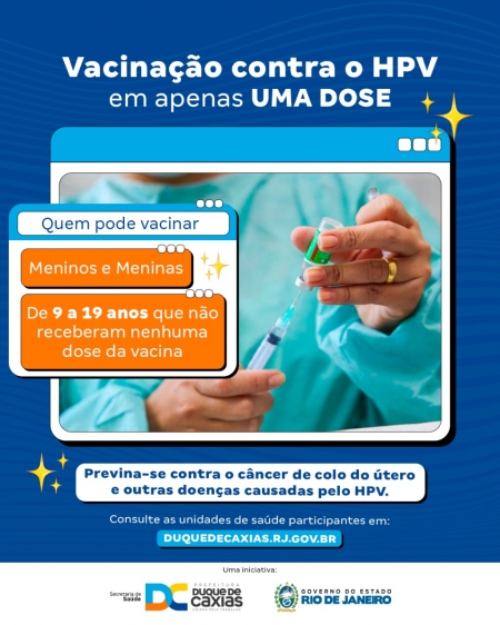 A Prefeitura de Duque de Caxias, através da Secretaria Municipal de Saúde, deu início à nova estratégia de vacinação – agora em dose única – contra o vírus HPV, causador do câncer de colo do útero e de pênis, entre outros tipos da doença. Seguindo a recomendação do Ministério da Saúde, o município passa a aplicar o imunizante em dose única em meninos e meninas de 9 a 19 anos. .