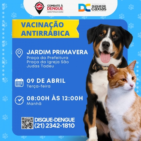A Prefeitura de Duque de Caxias segue com a campanha de Vacinação Antirrábica para cães e gatos nos quatro distritos. Nos dias 09 (terça) e 11 (quinta) de abril, a vacinação acontece nos bairros Jardim Primavera, Prainha e Vila Ideal. .