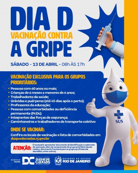 A Prefeitura de Duque de Caxias, através da Secretaria Municipal de Saúde, realiza, neste sábado (13/04), o dia D de vacinação contra a Gripe (Influenza). Das 8h às 17h, serão disponibilizados mais de 45 pontos de imunização, facilitando o acesso da população. .