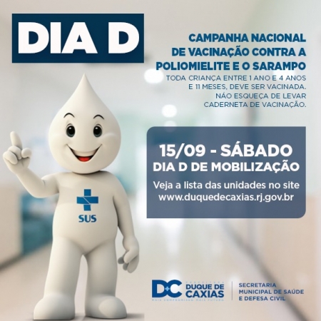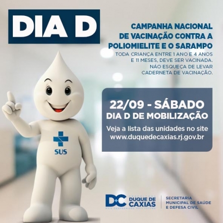 A Prefeitura de Duque de Caxias, através da Secretaria Municipal de Saúde, convoca a população para mais um Dia D de Vacinação Municipal Contra a Polio e o Sarampo, neste sábado, 15/09, das 8h às 17h. .
