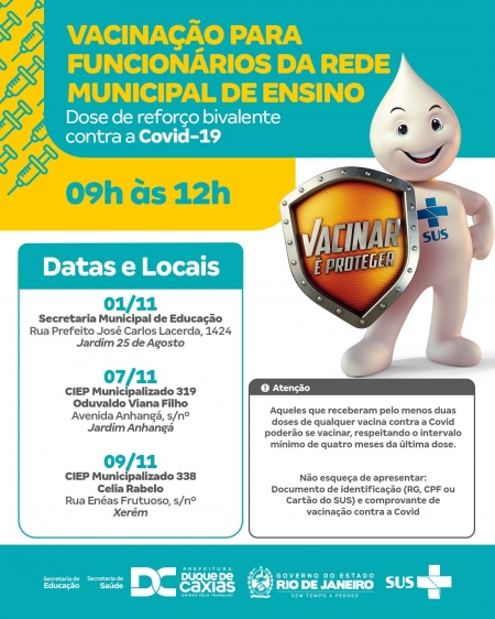 A Prefeitura de Duque de Caxias, através das Secretarias de Saúde e Educação, promoverá, a partir de amanhã (01/11), a campanha de vacinação da dose de reforço Bivalente contra a COVID para os funcionários da rede municipal de Ensino. A aplicação será feita em três locais distintos, sempre no período da manhã, no horário das 9h às 12h..
