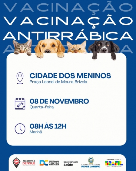 A Secretaria Municipal de Saúde de Duque de Caxias, através da Superintendência de Vigilância Ambiental, Vetores e Zoonoses (SVAVZ), levará a campanha de Vacinação Antirrábica para cães e gatos aos bairros Cidade dos Meninos e Parque Marilândia, nesta quarta-feira (08/11). .