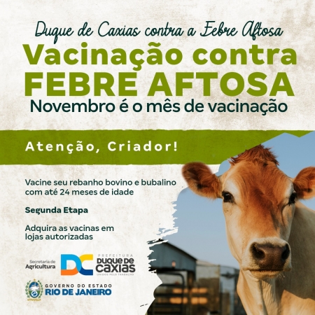A Prefeitura de Duque de Caxias, através da Secretaria Municipal de Agricultura, Abastecimento e Pesca, deu início, no dia 1º de novembro, a 2ª etapa da campanha de vacinação contra a febre aftosa. A campanha, que segue até 30/11, será destinada aos bovinos e bubalinos com até 24 meses de idade. Os produtores rurais do município de Duque de Caxias têm até o dia 7 de dezembro para declarar a vacinação..