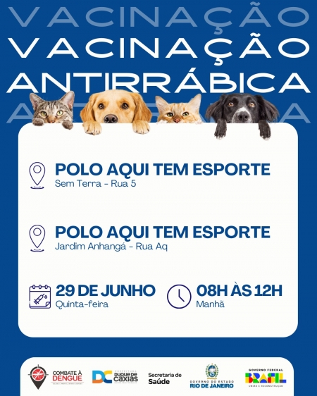 Entre os dias 03 e 06 de julho, a Secretaria Municipal de Saúde de Duque de Caxias, através da Superintendência de Vigilância Ambiental, Vetores e Zoonoses (SVAVZ), estará com a campanha de Vacinação Antirrábica para cães e gatos nos bairros: Vinte e Cinco de Agosto, Imbariê, Bosque do Ipê, Parque Eldorado, Vila Nova Esperança, São Bento e Mangueirinha. .