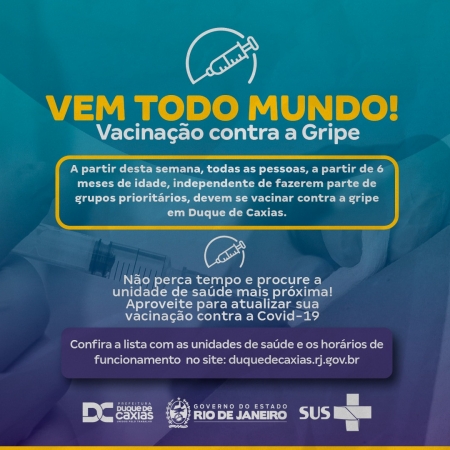 A Prefeitura de Duque de Caxias, através da Secretaria Municipal de Saúde, seguindo as determinações da Secretaria de Estado de Saúde – SES, ampliou a campanha de vacinação contra a Gripe (Influenza) para todas as pessoas, a partir de seis meses de idade..