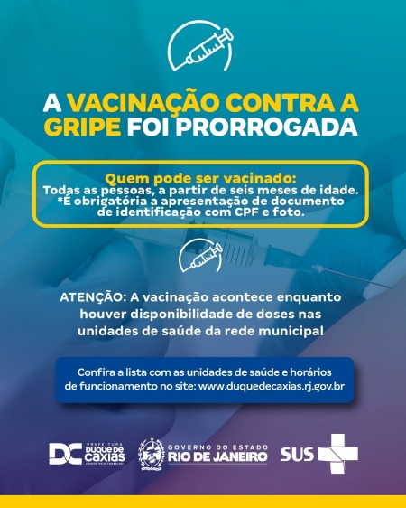 A Prefeitura de Duque de Caxias, através da Secretaria Municipal de Saúde, seguindo as determinações da Secretaria de Estado de Saúde – SES, prorrogou a campanha de vacinação contra a Gripe (Influenza) para todas as pessoas, a partir de seis meses de idade. .
