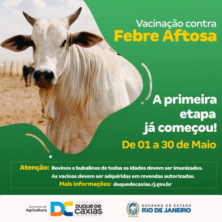 A Prefeitura de Duque de Caxias, através da Secretaria Municipal de Agricultura, Abastecimento e Pesca, deu início, no dia 1º de maio, a 1ª etapa da campanha de vacinação contra a febre aftosa. A campanha, que segue até 30/05, será destinada aos bovinos e bubalinos de todas as idades..