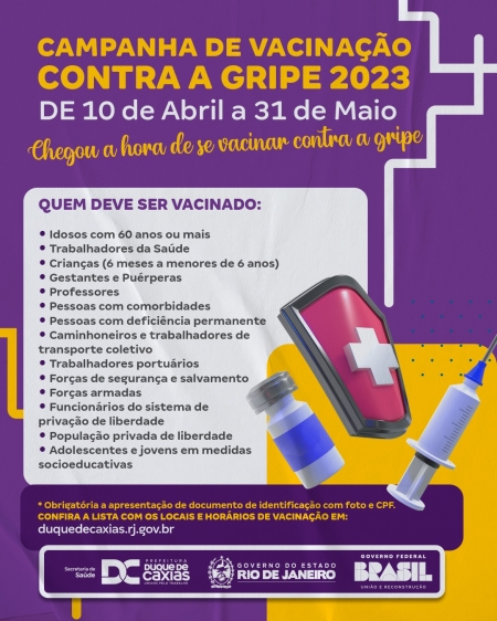 A vacina contra a gripe poderá ser tomada junto a outras do calendário nacional de vacinação, como a da Covid-19 A Prefeitura de Duque de Caxias, através da Secretaria Municipal de Saúde, inicia, na próxima segunda-feira (10/04), a campanha nacional de vacinação contra a gripe..