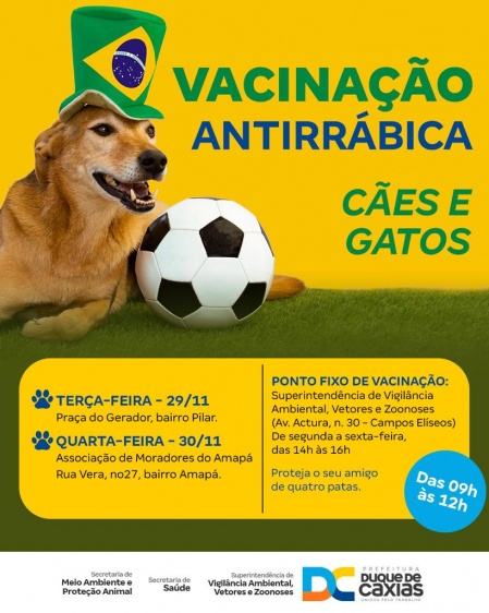A Prefeitura de Duque de Caxias, através da Superintendência de Vigilância Ambiental, Vetores e Zoonoses (SVAVZ), estará com a campanha de vacinação antirrábica para cães e gatos, entre os dias 29 e 30/11, nos bairros Pilar e Amapá. .