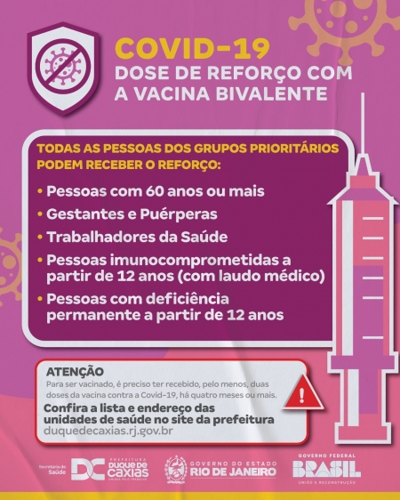 A Prefeitura de Duque de Caxias, através da Secretaria Municipal de Saúde, segue com a campanha de vacinação contra a Covid-19, com aplicação de todas as doses. Em breve terá início a campanha nacional com a vacina bivalente contra a Covid-19. Enquanto isso, a Secretaria de Saúde alerta a população sobre a importância de completar a imunização com a aplicação das duas doses de reforço (terceira e quarta doses)..
