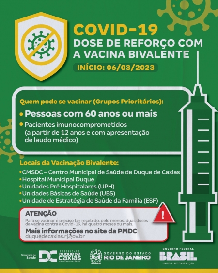 A partir desta segunda, 6 de março, a Prefeitura de Duque de Caxias, através da Secretaria Municipal de Saúde, dará início a segunda fase da a campanha de reforço contra a Covid-19, com a aplicação da Vacina Bivalente da Pfizer..