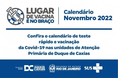 A Prefeitura de Duque de Caxias, através da Secretaria Municipal de Saúde, divulga o calendário de novembro, com os dias e horários de testagem rápida e vacinação da Covid-19, nas unidades de Estratégia de Saúde da Família (ESF) e Unidades Básicas de Saúde (UBS). As unidades fazem parte da rede de Atenção Primária do município..