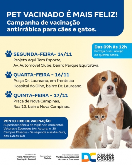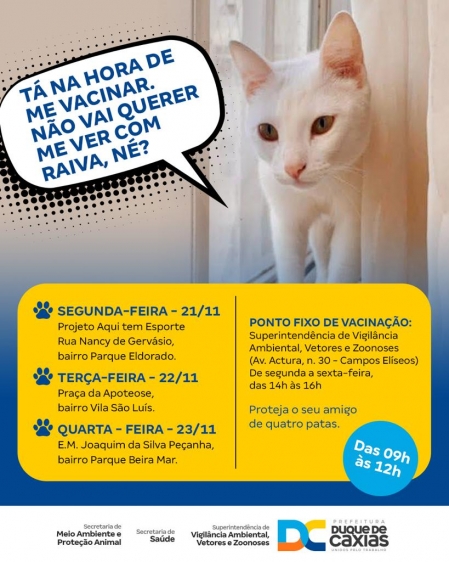 A Prefeitura de Duque de Caxias, através da Superintendência de Vigilância Ambiental, Vetores e Zoonoses (SVAVZ), segue com a campanha de vacinação antirrábica para cães e gatos. Entre os dias 21 a 23/11, as equipes de vacinação estarão nos bairros Parque Eldorado, Vila São Luís e Parque Beira Mar..