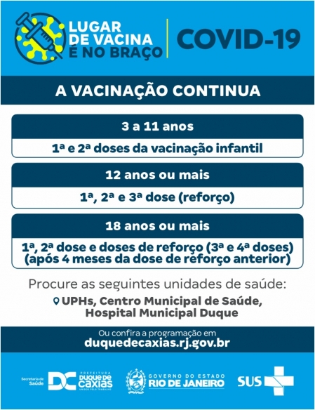 A Prefeitura de Duque de Caxias, através da Secretaria Municipal de Saúde, começa a semana com as seguintes campanhas de vacinação: Poliomielite, Covid-19 e Gripe Influenza. As campanhas acontecem nas unidades da rede municipal de saúde. .
