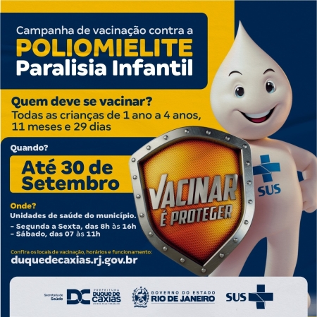 A Prefeitura de Duque de Caxias, através da Secretaria Municipal de Saúde, alerta aos pais e responsáveis sobre a prorrogação, até o dia 30 de setembro, das campanhas de vacinação contra Paralisia Infantil (Poliomielite) e Multivacinação no município. .