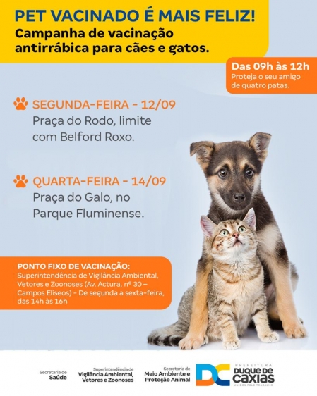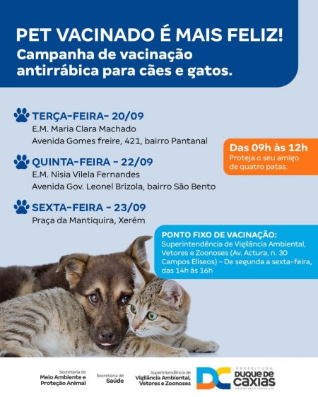 A campanha de vacinação antirrábica para cães e gatos, promovida pela Prefeitura de Duque de Caxias, através da Superintendência de Vigilância Ambiental, Vetores e Zoonoses (SVAVZ), chega a mais três bairros, entre os dias 26 e 28/09: Jardim Leal, Olavo Bilac e Bananal..