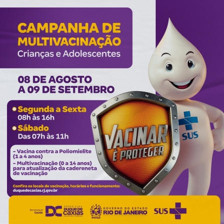 Nesta segunda-feira (08), a Prefeitura de duque de Caxias, através da Secretaria Municipal de Saúde, deu início à Campanha Nacional de Vacinação contra a Poliomielite, para crianças menores de cinco anos de idade, e Multivacinação para atualização da Caderneta de Vacinação da Criança e do Adolescente (Menores de 15 anos de idade). No dia 20 de agosto acontecerá o dia “D” de divulgação e mobilização nacional da campanha. A campanha nacional segue até o dia 09 de setembro..