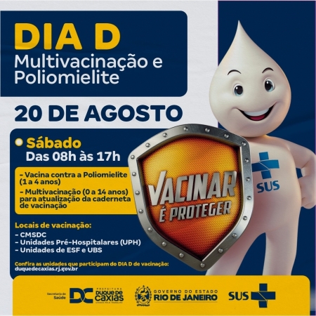 A Prefeitura de Duque de Caxias, através da Secretaria Municipal de Saúde, promove, neste sábado, 20 de agosto, das 8h às 17h, o Dia D da Campanha Nacional de Vacinação contra a Poliomielite, para crianças menores de cinco anos de idade, e Multivacinação, para atualização da Caderneta de Vacinação da Criança e do Adolescente (menores de 15 anos de idade). .