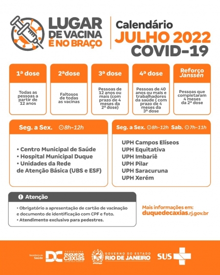 A Prefeitura de Duque de Caxias, através da Secretaria Municipal de Saúde, divulga o calendário de vacinação contra a Covid-19 e Gripe para a semana (18/07 a 23/07) nas unidades de saúde pública no município..