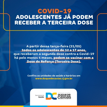 A Prefeitura de Duque de Caxias, através da Secretaria municipal de Saúde, começa nesta terça-feira (31/05) a aplicação da terceira dose (dose de reforço) contra a Covid-19 para adolescentes, com idade de 12 anos a 17 anos. Para estar apto a essa etapa, é preciso ter tomado a segunda dose no prazo de, pelo menos, quatro meses. As vacinas aplicadas podem ser apenas das fabricantes Pfizer ou CoronaVac, de acordo com a disponibilidade nas unidades de saúde. A ampliação do calendário de reforço para os adolescentes acontece após o anúncio do Ministério da Saúde, na última sexta-feira (27), de liberar essa etapa da vacinação para esse grupo. Até agora, a terceira dose estava disponível apenas para quem tinha acima de 18 anos ou imunossuprimidos..