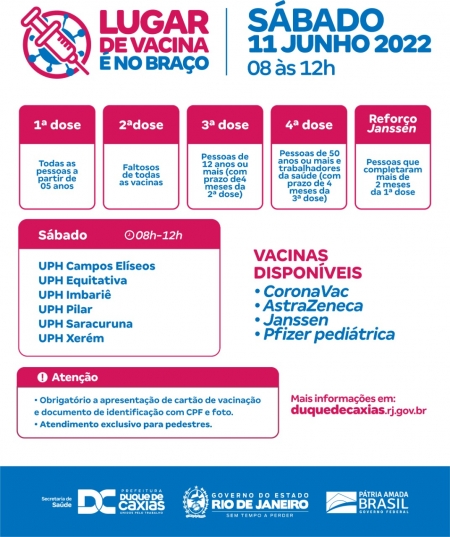 O sábado (11) será de vacinação de todas as doses contra a Covid-19 no município de Duque de Caxias. A Prefeitura de Duque de Caxias, através da Secretaria Municipal de Saúde, alerta que estarão disponíveis os seguintes imunizantes para a vacinação: Astrazeneca, Coronavac, Janssen e Pfizer pediátrica. .
