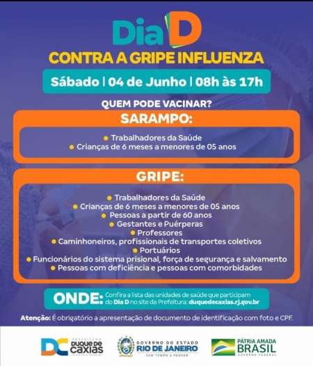 Neste sábado, 04/06, acontece mais um “Dia D” de vacinação contra gripe e sarampo no município de Duque de Caxias. O atendimento na campanha de vacinação será feito das 8h às 17h, em 50 unidades de saúde, nos quatro distritos do município. .