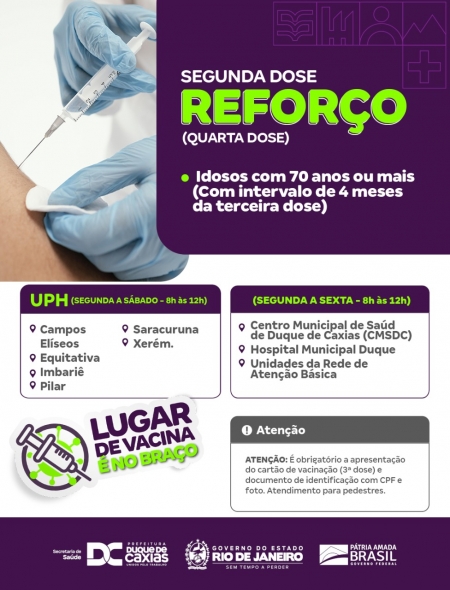 A Prefeitura de Duque de Caxias, através da Secretaria Municipal de Saúde, segue a semana (02 a 06/05) com a aplicação da segunda dose de reforço (quarta dose) da vacina contra a Covid-19 para os idosos com 80 anos ou mais, que tenham completado quatro meses da aplicação da terceira dose. A Secretaria Municipal de Saúde alerta que é obrigatório a apresentação do cartão de vacinação e documento de identificação com CPF e foto. .