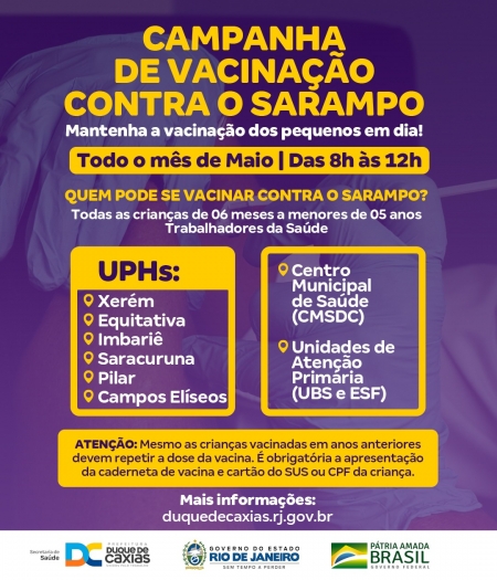 A Prefeitura Municipal de Duque de Caxias, através da Secretaria Municipal de Saúde, promove durante todo o mês de maio, a campanha de vacinação contra o Sarampo, nas redes de saúde do município. Podem receber a vacina todas as crianças de 6 meses a menores de 5 anos de idade e trabalhadores da área da saúde..