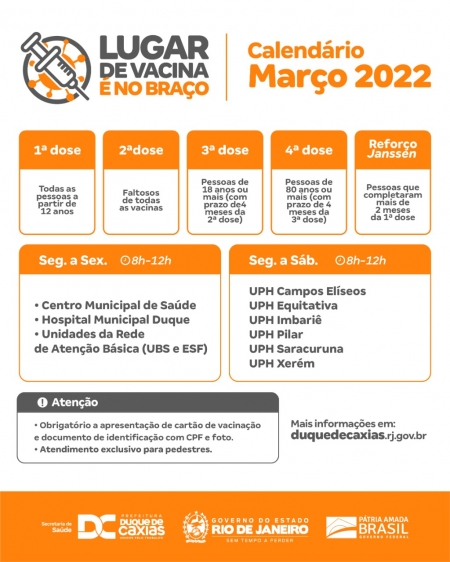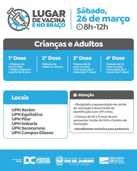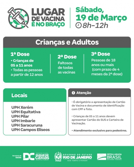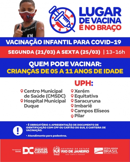 A Prefeitura de Duque de Caxias, através da Secretaria Municipal de Saúde, segue de segunda (21/03) a sexta-feira (25/03) com a vacinação contra a Covid-19 para crianças (05 a 11 anos), adolescentes (12 anos ou mais) e adultos. A Testagem Rápida para Covid-19 também acontece nas unidades de Atenção Básica. .