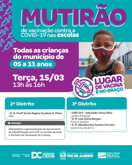 As secretarias municipais de Saúde e de Educação de Duque de Caxias seguem com a campanha de vacinação infantil (05 a 11 anos) nas escolas da rede municipal. Nesta terça-feira (15/03), a vacinação acontece das 13h às 16h, em unidades escolares nos bairros Pilar, Jardim Anhangá, Parque Paulista e Codora (Santa Cruz da Serra. O objetivo da campanha é incentivar a vacinação de todas as crianças nessa faixa etária, além de reforçar a segurança de alunos e profissionais de ensino nas unidades escolares..