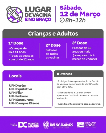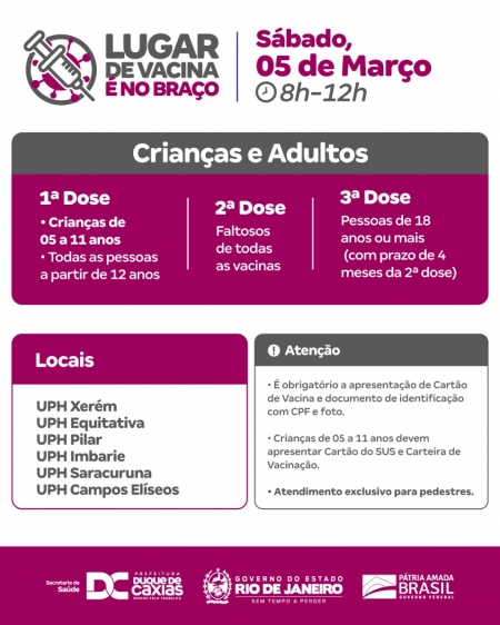 Duque de Caxias promove vacinação neste sábado (05/03), para crianças de 05 a 11 anos, adolescentes (a partir de 12 anos) e adultos. A Secretaria Municipal de Saúde alerta aos responsáveis sobre a obrigatoriedade de levar documento de identificação com CPF ou Cartão do SUS, e Carteira de Vacinação da criança..