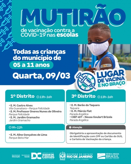 A Prefeitura de Duque de Caxias, através das secretarias municipais de Saúde e de Educação, promove na quarta-feira, 09/03, mais uma campanha de vacinação infantil (05 a 11 anos) nas escolas da rede municipal. O objetivo da campanha é incentivar a vacinação de todas as crianças, além de reforçar a segurança de alunos e profissionais de ensino nas unidades escolares..