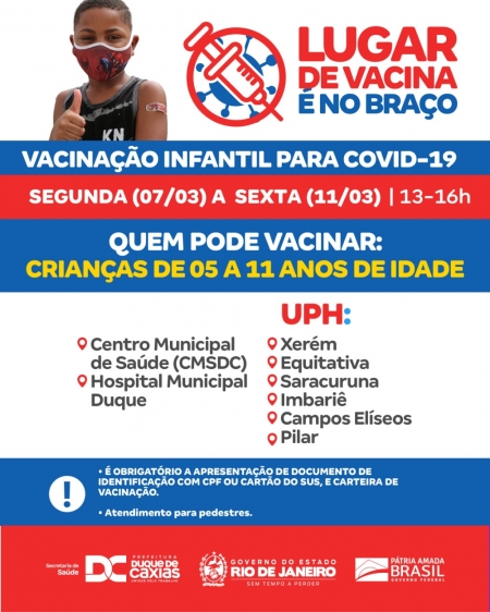 A Prefeitura de Duque de Caxias, através da Secretaria Municipal de Saúde, promove de segunda (07/03) a sexta-feira (11/03), vacinação para crianças (05 a 11 anos), adolescentes (12 anos ou mais) e adultos. A Testagem Rápida para Covid-19 também acontece nas unidades de Atenção Básica. .