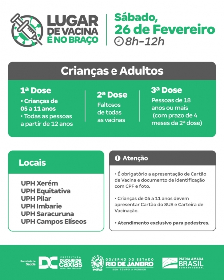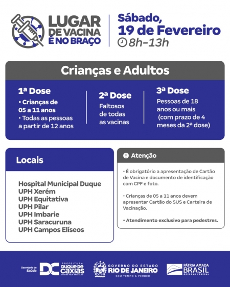 O sábado (19) em Duque de Caxias será de vacinação contra a Covid-19 para crianças de 05 a 11 anos, adolescentes (a partir de 12 anos) e adultos. A Secretaria Municipal de Saúde alerta aos responsáveis sobre a obrigatoriedade de levar documento de identificação com CPF ou Cartão do SUS, e Carteira de Vacinação da criança. .