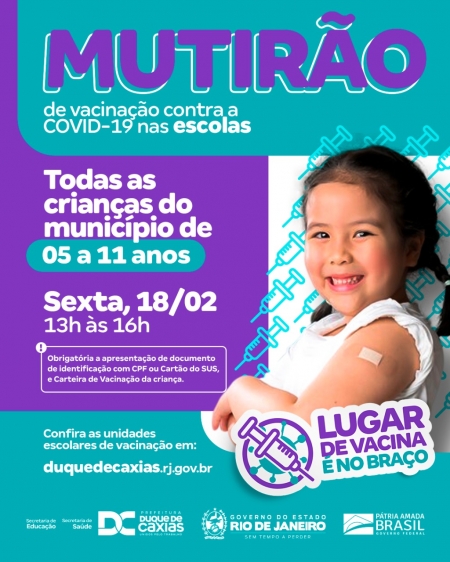 A Prefeitura de Duque de Caxias ampliou a faixa etária de crianças a serem vacinadas no município. Nesta terça-feira (15/02), podem receber a primeira dose da vacina contra a Covid-19, todas as crianças com idade de 05 a 11 anos. A Secretaria Municipal de Saúde alerta aos responsáveis sobre a obrigatoriedade de levar documento de identificação com CPF ou Cartão do SUS, e Carteira de Vacinação da criança. .