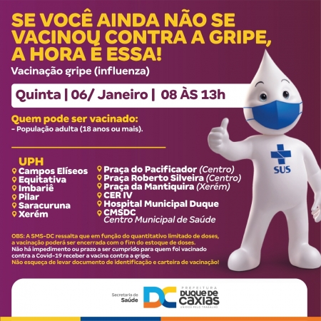 Nesta quinta-feira (06/01), o município de Duque de Caxias retoma a vacinação contra a Gripe (Influenza) em 12 pontos espalhados nos quatro distritos. A Prefeitura de Duque de Caxias, através da Secretaria Municipal de Saúde, esclarece que a retomada da vacinação contra a gripe está sendo possível graças a doação de 10 mil doses entregues ao município pela rede de farmácias Pague Menos, com o apoio da Ascoferj - Associação do Comércio Farmacêutico do Estado do Rio de Janeiro..