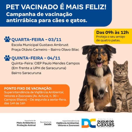 A Prefeitura de Duque de Caxias segue com a Campanha de Vacinação Antirrábica para cães e gatos no município. Nos dias 03 e 04 serão contemplados os bairros Olavo Bilac e Saracuruna..